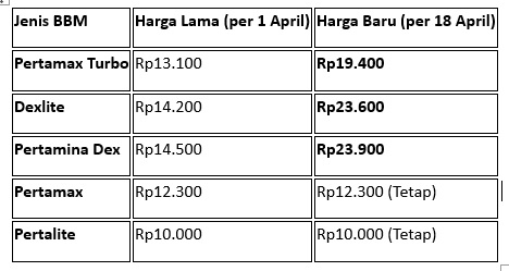Berdasarkan informasi harga BBM di situs Mypertamina perusahaan, kenaikan harga terjadi pada jenis Pertamax Turbo, Dexlite, dan Pertamina Dex. Sementara itu, harga BBM subsidi seperti Pertalite dan BioSolar, serta BBM nonsubsidi jenis Pertamax (RON 92) terpantau masih tetap.